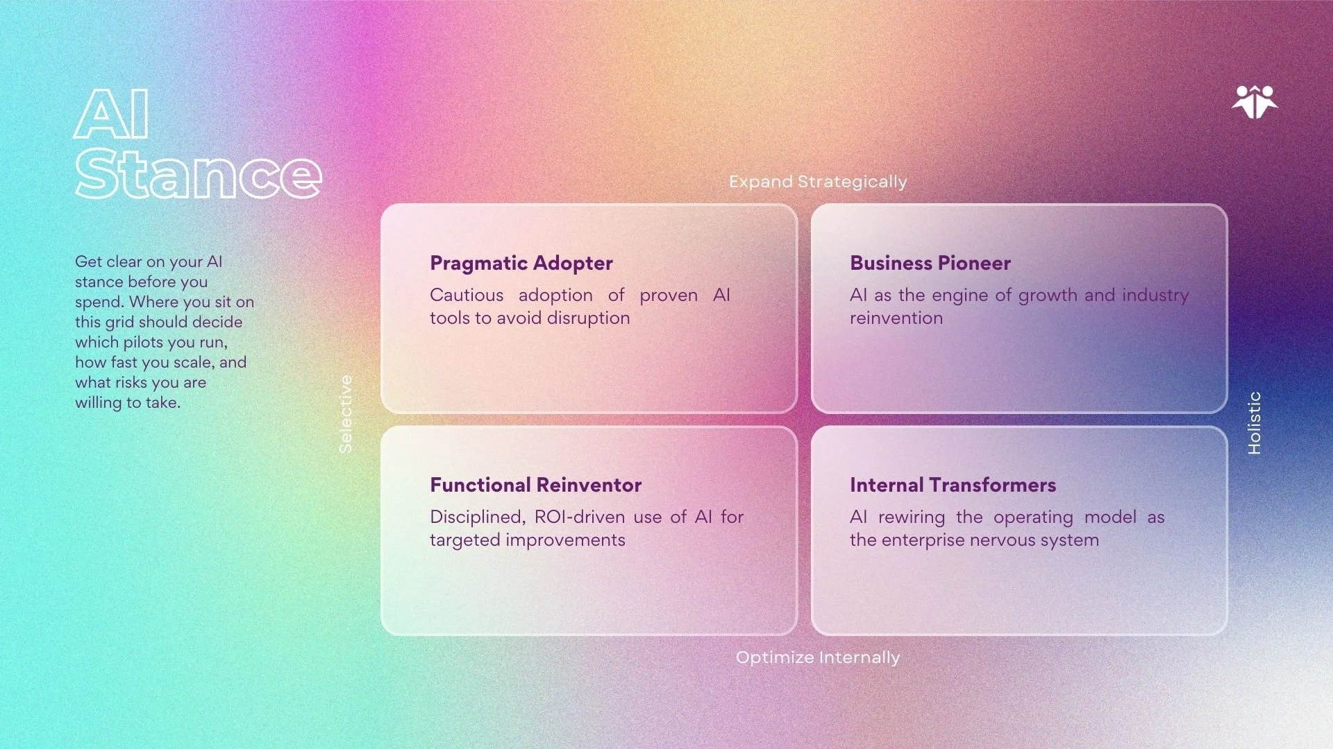 A simple way to see this is through four AI stance types, defined along two axes: whether you use AI selectively or holistically, and whether you focus on expanding strategically or optimising internally. These are not maturity levels; they are strategic choices, and different business units – including sustainability, can sit in different boxes and move as context shifts.